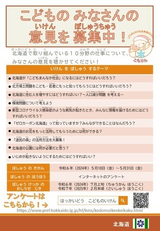 北海道では、こども基本法の制定に伴い、令和6年度に新たに実施する「こどもの意見反映推進事業」における「広域募集」(インターネットアンケート)を5月31日まで行っています。