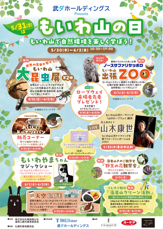 藻岩山の標高531mにちなんで5月31日を「もいわ山の日」とし、5月30日(木)~6月2日(日)の4日間でイベントを開催します。ノースサファリサッポロの出張ZOOや大昆虫展など、お子様が自然環境について楽しく学ぶことができるコンテンツが盛りだくさんです。ほかにも、マジックショーや人気キッチンカーの出店もあり、魅力満載のイベントとなっております。