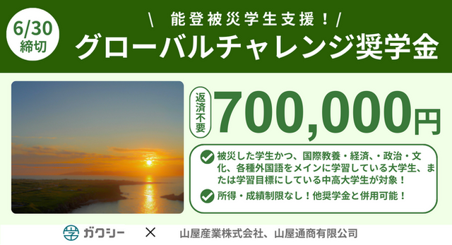 日本最大の奨学金プラットフォームを運営する株式会社ガクシー(本社:東京都港区、代表取締役:松原良輔、以下当社)では、地元石川県の繊維化学製品の製造および卸売を手がける山屋産業株式会社とその関係会社の協賛による給付型奨学金『【能登被災学生支援】グローバルチャレンジ奨学金』を本日から6月末日まで、奨学金情報サイト「ガクシー」にて募集を受け付けます。
