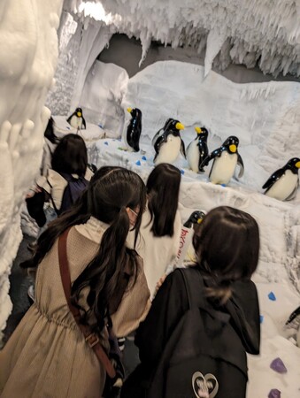 マイナス30度の世界を体験できるアトラクションを楽しむ中学生