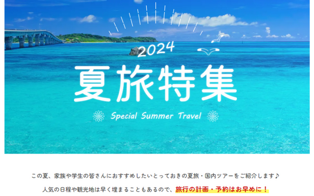 夏休みの旅行を計画しているファミリーや学生に向けたこの季節ならではのすてきな思い出作りができるツアーを豊富に取りそろえています。人気の日程や観光地は早く埋まることがありますので、夏旅行は早目のご予約をお勧めいたします。品ぞろえ豊富なこの機会をぜひお見逃しなく!
