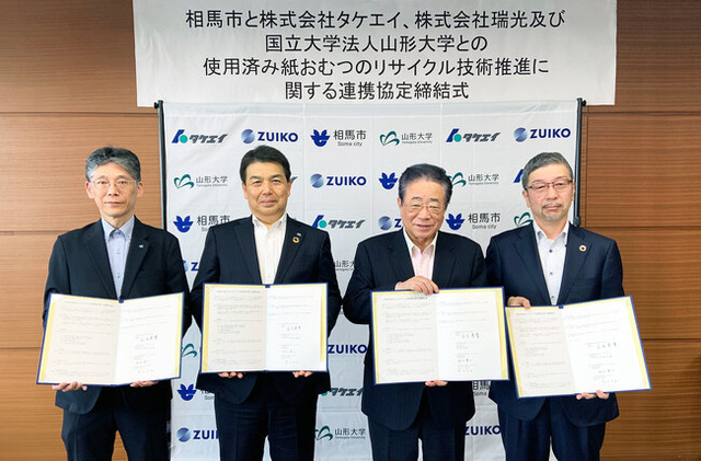 そして今般、使用済紙おむつの燃料化によるリサイクル技術の推進、及び再原料化の包括的なスキームの構築を目指して実証実験を行うべく、相馬市、タケエイ、瑞光、山形大学の4者は、連携協定を締結するに至りました。また、実証実験による各種データ(焼却量、CO2削減量、各コスト等)を収集し、事業化に向けた課題点の抽出を行います。さらに、当協定締結を背景とし、山形大学、瑞光、タケエイとの間で、「リサイクルが難しいとされる廃プラスチック類及び可燃系廃棄物の再資源化手法の確立・運用に関する研究」をテーマに共同研究契約を締結いたします。