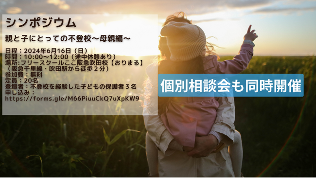 NPO法人ここ(事務所:大阪府吹田市、理事長:三科元明)は、2024年6月16日(日)にフリースクールここ阪急吹田校【おりまる】(大阪府吹田市泉町1丁目11番8号201)にて「シンポジウム『親と子にとっての不登校』~母親編~」を開催します。ゲストには、我が子が不登校になり紆余曲折を経てフリースクールに辿り着いた保護者のお母さん3名を迎え、あの頃「何を思い何に苦しんでいたか」だけではなく、そこからどのように考えどんな経験をされ今に至るのかをお話ししていただきます。