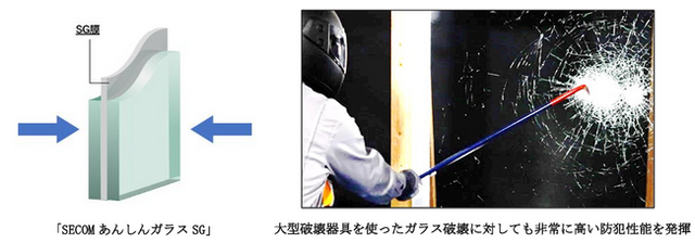 このたび発売する「SECOMあんしんガラスSG」は、ガラス業界のリーディングカンパニーであるAGC株式会社の協力のもとセコムが開発・販売する商品であり、2枚のガラスの間に、引き裂き強度が強く強靭なSG膜を挟んでいるため、強い打撃や衝撃を受けても貫通させることが極めて困難な構造となっています。大型の破壊器具を使ったガラス破壊に対しても、非常に高い防犯性能を発揮します。さらに、「セコム・ホームセキュリティ」と組み合わせることで、センサーが破壊行為を即座に検知、必要に応じてセコムが駆けつけるなど、犯罪の初期段階で迅速な対応ができるため、被害の拡大防止につなげることができます。