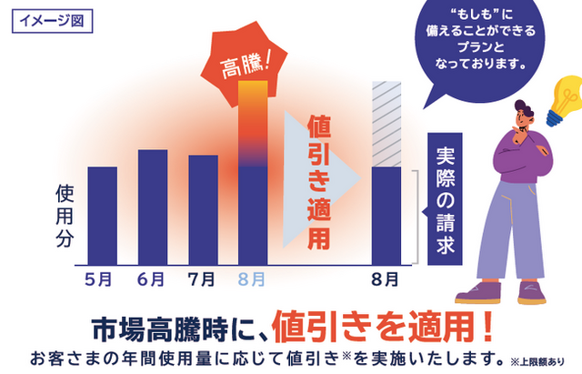市場高騰時に値引きが適用されるため、高騰に対する事前対策が可能なプランです。さらに、契約年数が長くなるほど高騰時の値引き上限額がUPいたします。