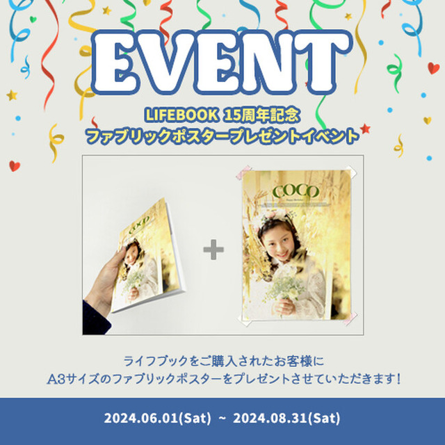 ライフスタジオの代表商品として、たくさんご愛好いただいているライフブックの販売15周年を記念してプレゼントイベントをご用意しました!期間内にライフブックをご購入されたお客様に、ライフブックカバーデザインで作ったA3サイズのファブリックポスターをプレゼントさせていただきます。