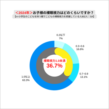 小学生のこどもを持つ親に調査したところ、裸眼視力が1.0未満の小学生は36.7%でした。文部科学省の学校保健統計調査によると、裸眼視力が1.0未満のこどもは、1979年度には17.91%で、2022年度には37.88%と、2倍以上に増えています。