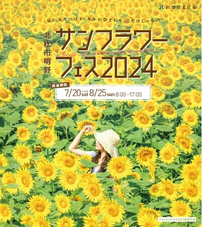北杜市明野サンフラワーフェス実行委員会(会長:秋山俊和)は、日本有数の日照時間の長さを誇る山梨県北杜市明野町で、令和6年7月20日(土)から8月25日(日)の期間、八ヶ岳・南アルプス・富士山の大パノラマの中に約40万本のひまわりを咲かせる「北杜市明野サンフラワーフェス2024」を、山梨県北杜市(市長:上村英司)の後援にて開催いたします。会場では、4ヘクタールのひまわり畑の中を自由に散策できるほか、市内の特産物などを使った飲食店等が出店する「青空市場」を楽しむことが出来ます。