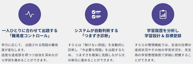 一人ひとりの理解度に合わせて国・数・理・社・英の5教科を学習できるアダプティブなICT教材です。レクチャー機能、ドリル機能、テスト機能により、一人ひとりの習熟度に応じて理解定着→活用のサイクルを繰り返し、学習内容の定着をワンストップで実現できます。