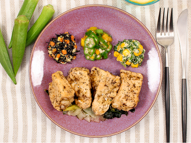 副菜はひじきの卵サラダ、黄パプリカの入ったオクラのおひたし、春菊の白あえです。