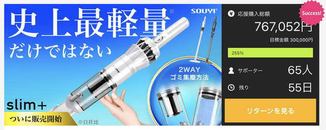掲載開始初日で目標応援購入額を達成いたしました!URL : https://www.makuake.com/project/souyi_cleaner/