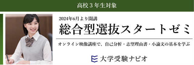株式会社増進会ホールディングス(Z会グループ)のグループ会社、株式会社栄光(本社:東京都千代田区 代表取締役社長:下田勝昭)が運営する大学受験専門塾「大学受験ナビオ」は、高校3年生対象「総合型選抜スタートゼミ」を、2024年6月1日(土)から開講します。オンライン配信の映像講座なので、都合のよい時間に受講ができ、総合型選抜で求められる「自己分析・志望理由書・小論文」の基本を着実に固められます。