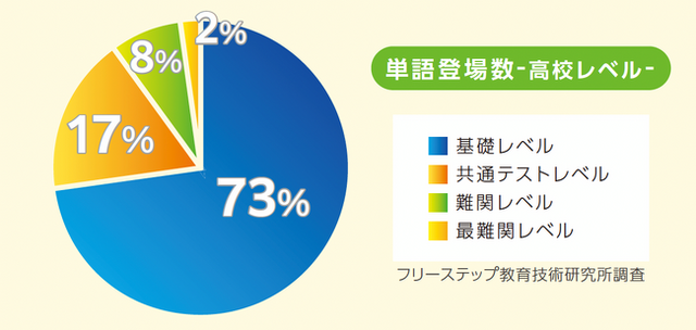2024年度大学入学共通テスト英語リーディングに登場した単語を調べてみると、基礎レベル73%、共通テストレベル17%、これら2つのレベルの英単語が90%も占めています。