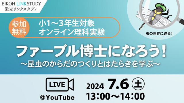 株式会社増進会ホールディングス(Z会グループ)のグループ会社、株式会社栄光(本社:東京都千代田区 代表取締役社長:下田勝昭)が運営するオンライン進学塾「EIKOH LiNKSTUDY(栄光リンクスタディ)」は、小学1~3年生対象のオンライン理科実験教室「ファーブル博士になろう!~昆虫のからだのつくりとはたらきを学ぶ~」を、2024年7月6日(土)13:00~14:00に無料開催します。折り紙を使って昆虫のからだのつくりを詳しく学びます。夏休みの自由研究にもおすすめです。