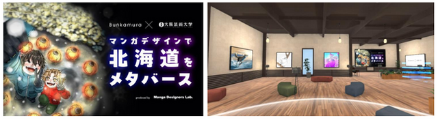 Bunkamuraメタバースの「Gallery」での『小樽芸術村デジタルアーカイブ 迫力の浮世絵展』(*2)の公開にあわせて、「小樽芸術村」がある北海道に関連し、大阪芸術大学のデザイン学科、キャラクター造形学科、美術学科、映像学科等の学生が北海道の魅力をマンガデザイン(R)で表現した約170作品の中から、選抜された全22作品(デジタルポスター9作品、映像13作品)を同メタバース内の「Community Space」でご覧いただけます。マンガデザイン(R)の力で北海道へのツーリズムを誘うきっかけを創出します。