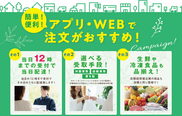 ご注文は、平和堂ネットスーパーアプリやWEBサイトから24時間受け付けています。12時までにご注文いただくと、当日中に商品をお届けします。