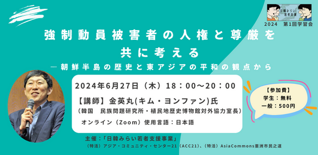 (特活)アジア・コミュニティ・センター21(略称:ACC21、代表理事:伊藤道雄)は、日中韓の市民活動家や在日外国人との交流に取り組む(特活)AsiaCommons 亜洲市民之道(略称:AsiaCommons)と、6月27日(木)に、日韓みらい若者支援事業第1回学習会をオンラインで開催します。