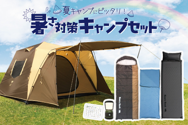 夏キャンプを快適に過ごしていただくために、テント・寝袋・ランタン・インナータオル・持ち物リストをセットにした4人分のキャンプセットを販売いたしました。