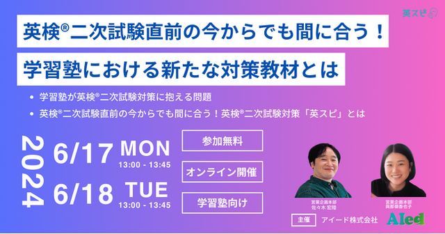 アイード株式会社(本社:東京都新宿区、代表取締役:窪田優希、以下「アイード」)は、このたび学習塾向け英検(R)︎二次試験対策アプリ「英スピ」を本格リリースいたしました。また7月に迫る英検(R)︎二次試験に向け、問い合わせが増えておりますので、緊急ウェビナーを開催いたします。