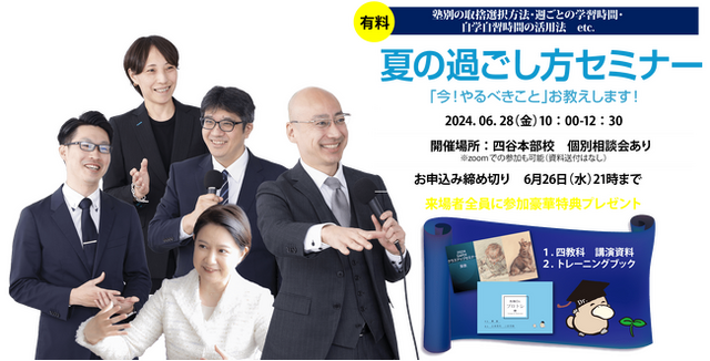 第一志望合格のため、夏期講習期間を活かすには、下準備・知識が大切です。これまで数多くの受験生を合格へと導いてきた、当塾の自慢の講師がプロならではの視点で伝える学習戦略を是非ご体験ください。