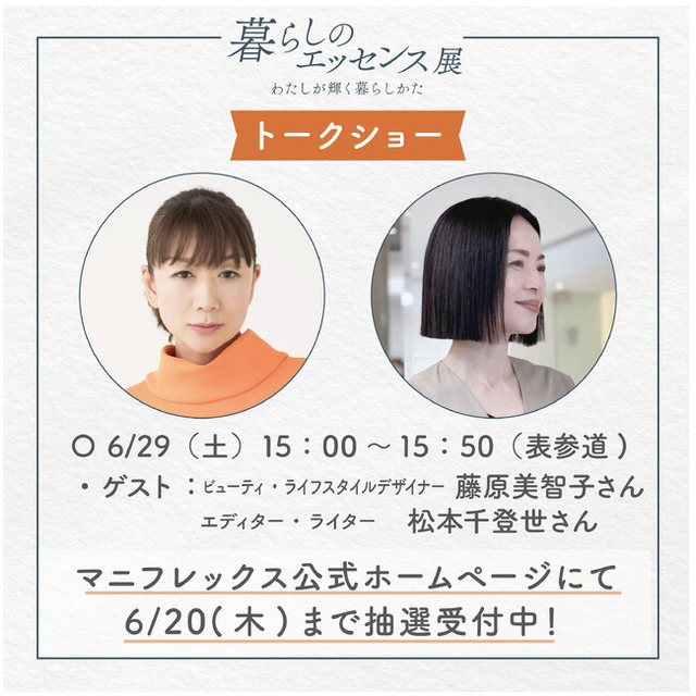 ビューティ・ライフスタイルデザイナーの藤原美智子さんとエディター・ライターの松本千登世さんに登壇いただきます。暮らしのエッセンスの記事では紹介しきれなかったエピソードや事前に寄せられた暮らしにまつわる質問を伺います。