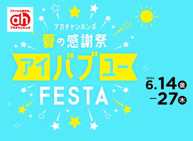 昨年、好評をいただきました「バブーFESTA」が更に進化!“アカチャンホンポ夏の感謝祭”をテーマに、夏に向けたさまざまなお役立ちグッズを取り揃えました。出産準備品からベビー・キッズの夏のお出か け必需品をご用意いたしました。帽子やTシャツ、快適おへやグッズや目玉プライスのおもちゃまで!本格的な夏を前に、今欲しいアイテムをアカチャンホンポが厳選いたしました。
