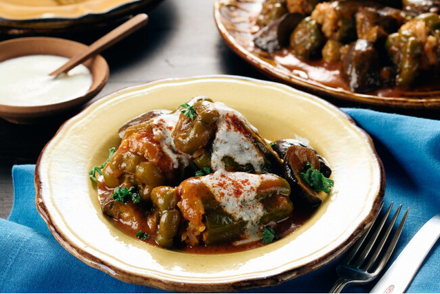 商品詳細 :トルコの家庭料理ドルマをイメージし、ピーマンの肉詰めを新解釈で作ります。トマトソースで煮込んでとろりとしたピーマンやなすに、オリーブオイルの香りがするヨーグルトソースをたっぷりかけて完成です。