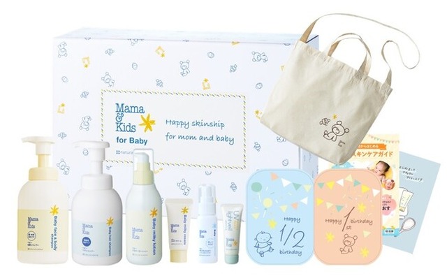 生まれたその日から使えるスキンケア・ボディケアを揃えた「ベビースキンケアギフトセット」をさらに充実させたセット。押すだけでふわふわの泡がでてくる「ベビー全身シャンプー」や「ベビーヘアシャンプー」、大人気の乳状ローション「ベビーミルキーローション」のほか、「ベビーミルキークリーム」、お尻の汚れをするんと落とす「ベビースキンフレッシュナー」、低刺激のUVケア「UVライトベール」がイン。