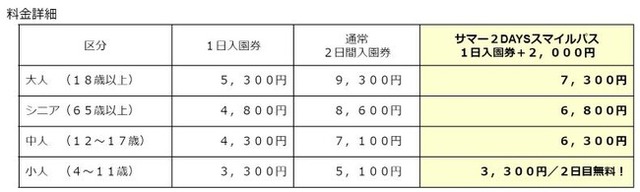 ※Terravieでご購入いただいた 1日入園券(大人5,100円)をアップグレードする場合は、「2DAYSサマースマイルパス」(大人7,300円)との差額、2,200円を頂戴いたします。他の券種も同様になりますので予めご了承ください。