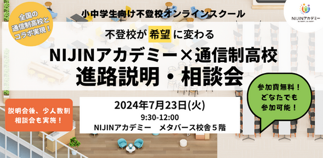 日本中の学校をハッピーにする株式会社NIJIN(本社:東京都江東区、代表取締役:星野達郎)が運営する小中学生向けオンラインスクール「NIJINアカデミー」は、不登校の小中学生を対象にしたキャリア教育の一環として、7月23日(火)に通信制高校による進路説明・相談会を開催致します。