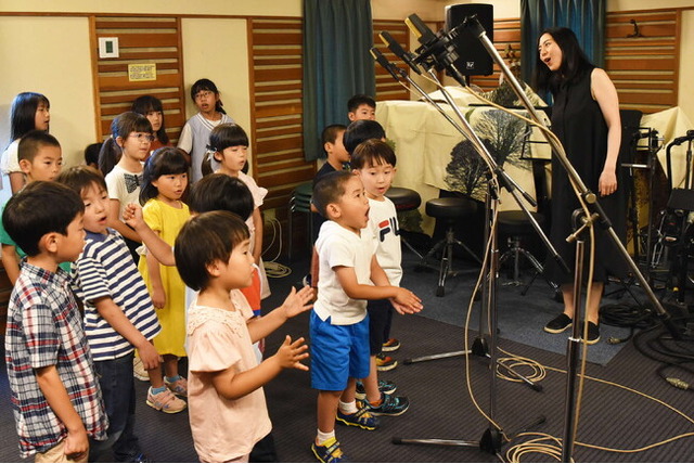 丁寧な指導を受けた後、子どもたちは楽しくレコーディングに参加。収録後は子どもたちから植村さんへのメッセージカードが手渡され、和やかな雰囲気のなか子どもたちはスタジオを後にしていました。