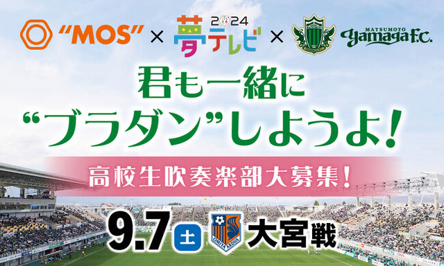 このたび、3月9日(土)開幕戦の際にサンプロアルウィンのピッチでパフォーマンスいただきました、管楽器ガールズグループ「MOS」とSBC信越放送「夢テレビ」と松本山雅FCのコラボレーション企画として、「MOS×夢テレビ×松本山雅FC 君も一緒に“ブラダン”しようよ!」を開催することが決まりましたので、お知らせいたします。