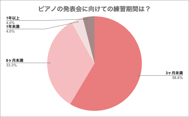 「ピアノの発表会に向けての練習期間は?」と質問したところ、『3ヶ月未満(58%)』と回答した方の割合が最も多く、次いで『6ヶ月未満(33%)』、『1年未満(4%)』、『1年以上(4%)』と続きました。