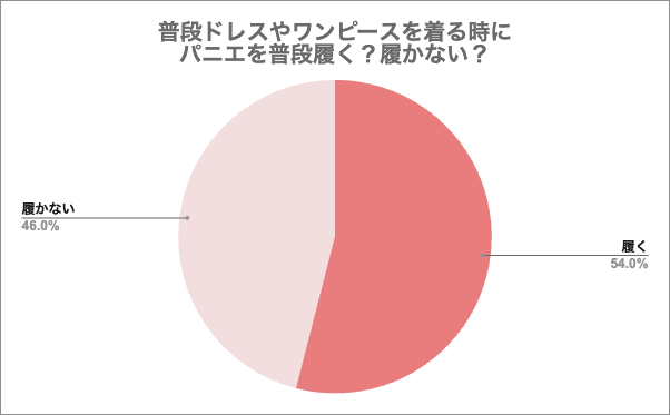 次に、「普段ドレスやワンピースを着る時にパニエを普段履く?履かない?」と質問したところ、『履く(54.0%)』と履く方が多く、『履かない(46.0%)』が少数派となりました。