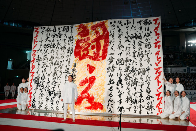 大会は演技時間6分間の中で、縦4m×横6mの巨大な用紙に向かい、音楽に合わせて様々なパフォーマンスをしながら自分たちの思いを揮毫します。書道パフォーマンスは、不断の努力とチームワークをもとに、書と演技の美しさを競う、まさに総合芸術です。