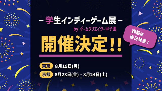 「ゲームクリエイター甲子園」は、次の時代のゲームクリエイターが同じ制作仲間に出会い、切磋琢磨し、多様なチャンスを掴む環境として、成長型コンテストという形で年間を通じた「学びと発表の場」を作っています。「学生インディーゲーム展」では、これから世界へと羽ばたいていく若手クリエイターが作品を発表できるショウケースであり、今回東京、京都の2ヵ所で開催する運びとなりました。