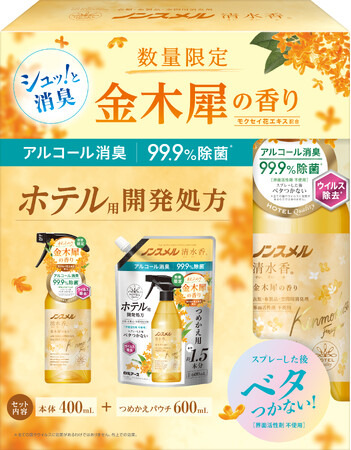 今回、秋限定の香りとして毎年好評をいただいている『金木犀の香り』より「本体・つめかえパウチセット」を数量限定で発売いたします。本体400mLとつめかえ後のゴミの量を減らせるつめかえパウチ600mLが入ったトライアルユーザーやリピーターのお客様にもご満足いただけるセットとなっています。また、本体400mL、つめかえパウチ600mLの単品も再度数量限定で発売いたします。