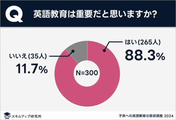 「英語教育は重要だと思いますか」という質問に対し、88.3%が「はい」と回答。英語教育の必要性について、多くの人が実感していることが明らかになった。