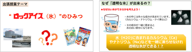今回は教材として「ロックアイス(氷)のひみつ」を使用し、なぜ透明な氷ができるのか?など身近なテーマをはじめに、熱中症予防やスポーツアイシングなど日々の生活やクラブ活動にも活用できる授業を実施します。6月19日より三鷹市立第四小学校、渋谷区立代々木山谷小学校、八千代市立八千代台西小学校をはじめ首都圏・関西エリアの5つの小学校で出張授業を実施します。