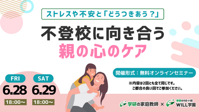 株式会社 学研ホールディングス(東京・品川/代表取締役社長:宮原博昭)のグループ会社、株式会社 学研エル・スタッフィング(東京・高田馬場/代表取締役社長:伊藤弘雅)は、展開する「学研WILL学園」でお引き受けしている生徒保護者様より、日々ご相談いただいている「親の心のケアはどうすればいいのか?」というテーマにお答えするべく、長年にわたり不登校生の保護者の皆様の支援に携わってきた正田温子先生をお迎えして、2024年6月28日(金)と6月29日(土)に「ストレスや不安とどうつきあう?~不登校に向き合う親の心のケア」無料オンラインセミナーを開催します。