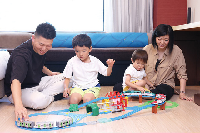 4名様までご利用いただけるファミリールームで貸出し用のプラレールセット(車両・レール・情景)を、レイアウト例を参考にして走らせたり、色々な工夫でレイアウトしたりと、楽しさいっぱいです。プラレール好きのお子様と一緒にご家族でお楽しみいただける至福の1泊2日です。客室は靴を脱いで過ごすフローリング床なので、プラレールを広げて遊びやすい設計。トイレと別々の独立型バスルームは洗い場付きで、ジェットバス機能も搭載しているので、ゆったりとおくつろぎいただけます。