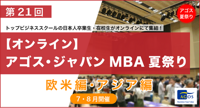 海外トップ大学・大学院留学準備指導校を運営する株式会社アゴス・ジャパン(取締役会長:横山 匡、本社:東京都渋谷区)は、2024年7月15日(月・祝)・21日(日)、8月10日(土)・11日(日・祝)の4日間にて、ハーバード、スタンフォード、ケンブリッジ、シンガポール国立大学等、50校以上の欧米アジアMBAトップスクールの日本人卒業生・在校生がオンラインで集結する、第21回「アゴス・ ジャパン MBA夏祭り」を開催いたします。