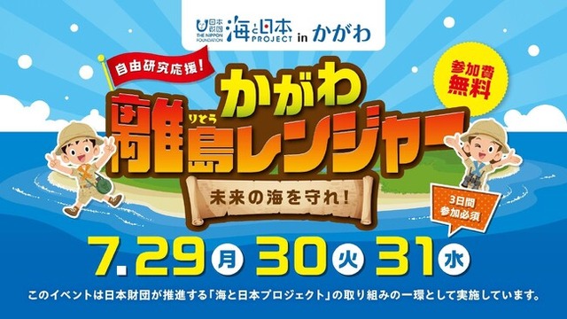 一般社団法人海と日本プロジェクトinかがわは7月29日(月)~31日(水)の3日間、丸亀沖の本島を舞台に体験学習イベント<かがわ離島レンジャー 未来の海を守れ!>を開催いたします。このイベントは、次世代へ豊かで美しい海を引き継ぐために、海を介して人と人とがつながる“日本財団「海と日本プロジェクト」”の一環です。