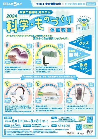 東京電機大学(学長 射場本忠彦)は、足立区教育委員会との連携企画として、8月1日(木)~31日(土)の1カ月間、足立区内の小学5年生を対象に、オンデマンド配信により、自宅などで動画を見ながら実験や工作にチャレンジできる「科学・ものづくり体験教室」を開催します。