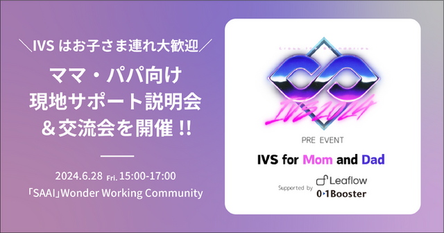株式会社ゼロワンブースター(本社:東京都千代田区、 代表取締役:合田ジョージ、以下「01Booster」)とCBD飲料スタートアップの株式会社Leaflow(東京都港区、代表 長森ルイ、以下「Leaflow」)は、6月28日(金)15:00よりワーキングコミュニティ「有楽町『SAAI』Wonder Working Community」にて 、「IVS2024 KYOTO / IVS Crypto 2024 KYOTO」の IVS公認プレイベントとして【IVS当日に子連れのママ・パパが受けられるサポートの説明会および、子連れ参加者同士の交流会イベント】を共催いたします。