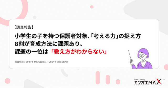 事業共創カンパニーである株式会社Relic(本社:東京都渋谷区、代表取締役CEO:北嶋貴朗、以下、Relic)は、高度な情報化ニーズに対応するITソリューションプロバイダーである株式会社オージス総研(代表取締役社長:吉村和彦、以下、オージス総研)を共創パートナーとして、小学生向けの“言語で考える力”を育てる教育webアプリ「カンガエMAX。」を提供しています。このたび、小学生の子どもを持つ保護者のべ1,658名を対象に、「考える力」に関するアンケート調査を実施しました。調査の結果で明らかとなった、「『考える力』の重要性を認識するも育成方法がわからない」という課題に対し、教育をはじめとした様々な分野の専門家による思考を深める環境作りのヒント集をwebサイト(https://kangaemax.com/column/list)に公開しました。