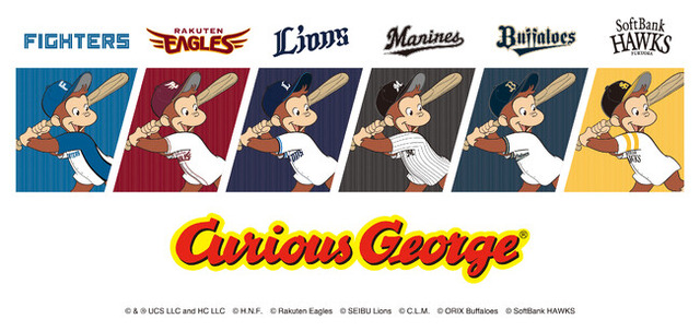 「おさるのジョージ」は世界中で80年以上に渡り、親から子へ、さらにその子へと親しまれてきた人気キャラクターです。今回パ・リーグ6球団との初コラボでは、「おさるのジョージ」が各球団のユニフォームを着用したぬいぐるみ、6球団オリジナルデザインのぬいぐるみボール、試合観戦時に活躍するタオル類、小物雑貨など、親子で楽しめる商品ラインナップにて展開いたします。