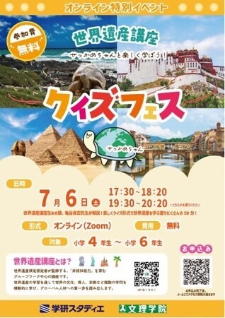 株式会社 学研ホールディングス(東京・品川/代表取締役社長:宮原博昭)のグループ会社、株式会社文理学院(山梨・都留/代表取締役社長:小倉勤)は、7月6日(土)の「世界遺産講座クイズフェス」と、7月20日(土)~8月18日(日)の「世界遺産講座」に夏期講習参加の小学4~6年生を無料で招待します。