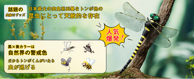 当社の虫除けトンボ君は、超耐久性のあるPVC素材で作られており、リアルな色合いで手描きされています。視覚的にも触覚的にも魅力的なデザインで、長寿命で繰り返し使えるため、地球環境にも優しいです。