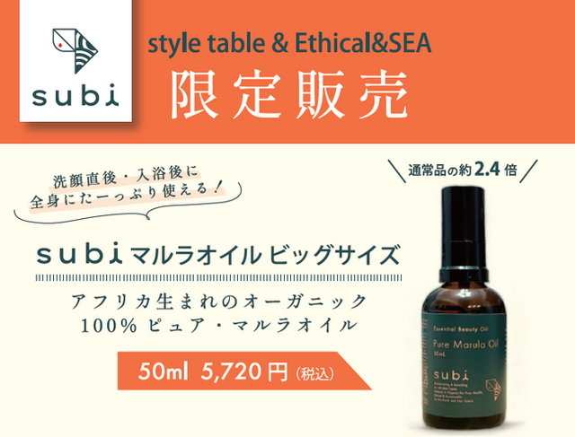 株式会社フラッグ(東京都中央区 代表取締役:吹上直子)が運営するエシカルセレクトショップブランド「style table」(スタイルテーブル)「Ethical&SEA」(エシカルシー)店頭にて、「subi」のマルラオイルのビッグサイズを数量限定販売いたします。